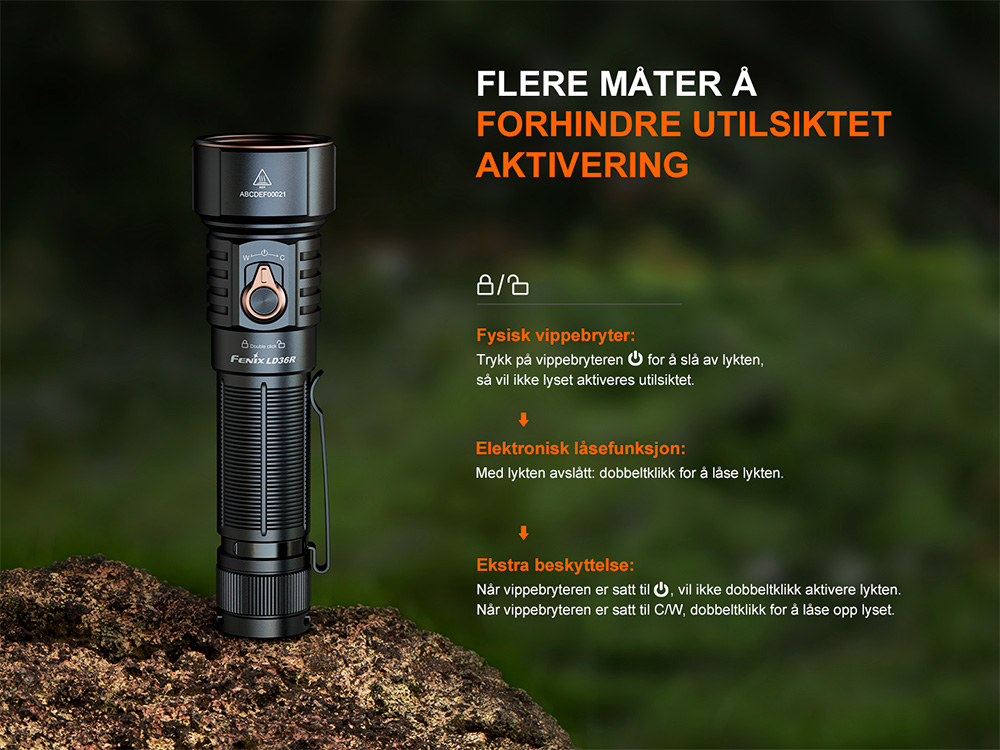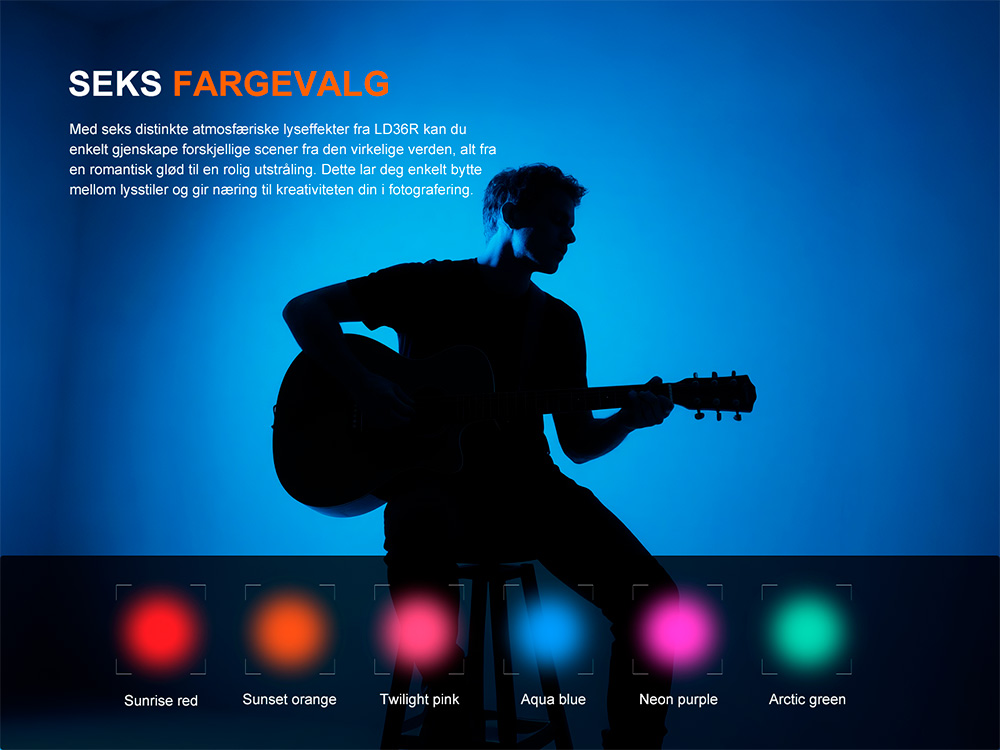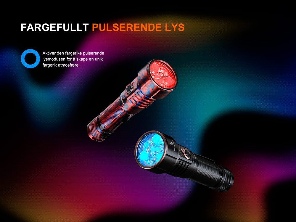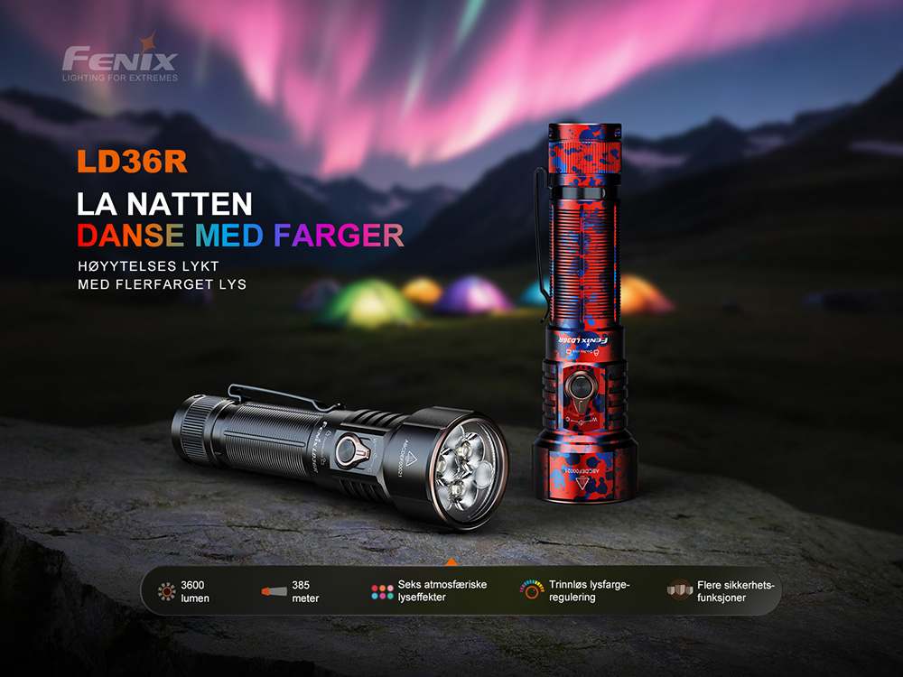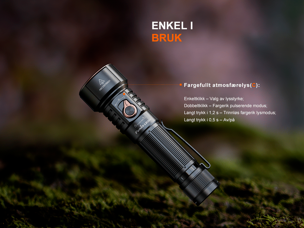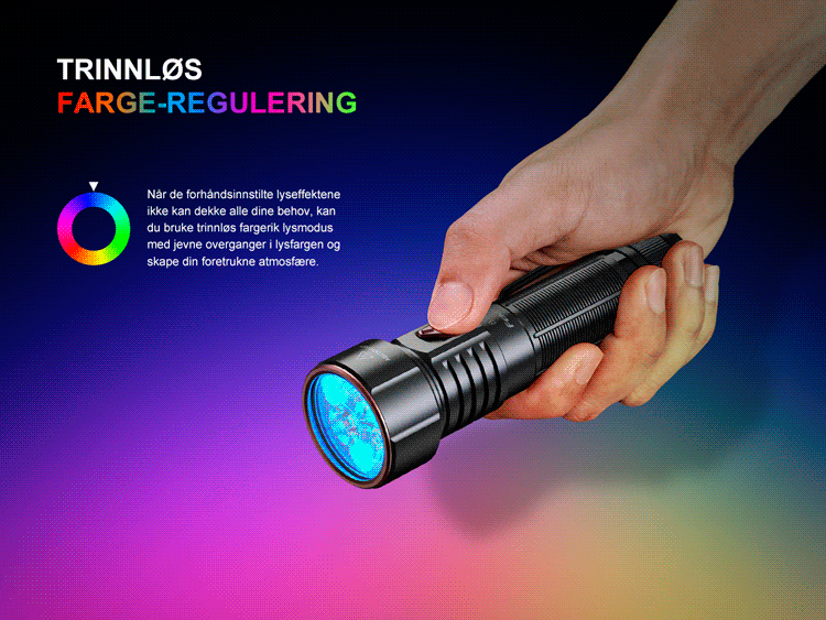 LD36R-lommelykten er din ultimate belysningsløsning med en kraftig lysstyrke på 3600 lumen og maks rekkevidde på 385 meter. Med både hvitt og fargerikt lys med trinnløs justering tilbyr denne lommelykten forskjellige lyseffekter og lar deg velge din foretrukne lysfarge.