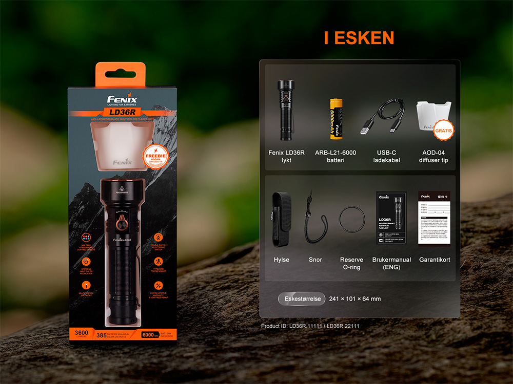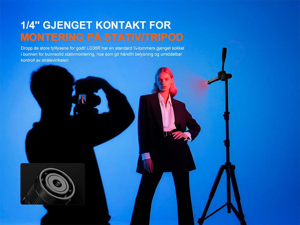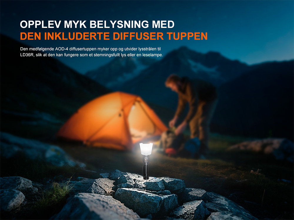 LD36R er designet til å være enkel i bruk med en vippebryter og en elektronisk bryter for enhåndskontroll. Pakken leveres med et høykapasitetsbatteri på 6000 mAh, som kan lades opp gjennom den indre vanntette USB-C-porten i lykten. I tillegg har lykten et ¼-tommers gjenget tripod-feste i enden, slik at den kan monteres sikkert på et stativ for håndfri belysning. Med den medfølgende diffusertuppen kan du raskt forvandle LD36R til en lese- eller flerfarget atmosfærisk lampe. LD36R er ideell for fjellklatring, camping, fotturer og fotografering, og kombinerer kraft og multifunksjonalitet i en elegant, allsidig lommelykt.