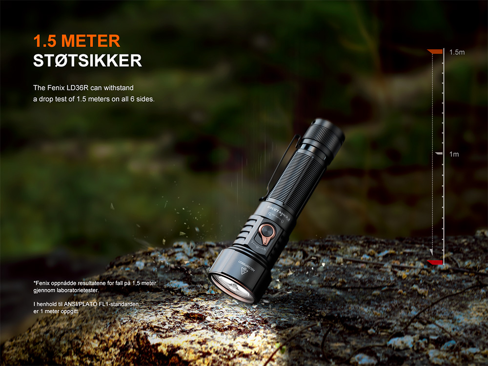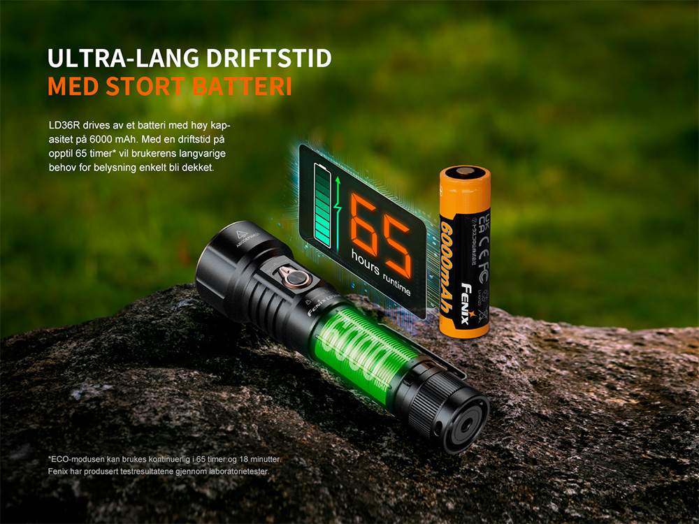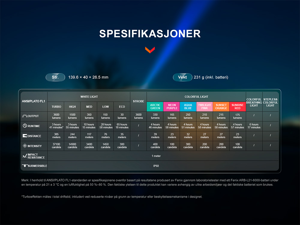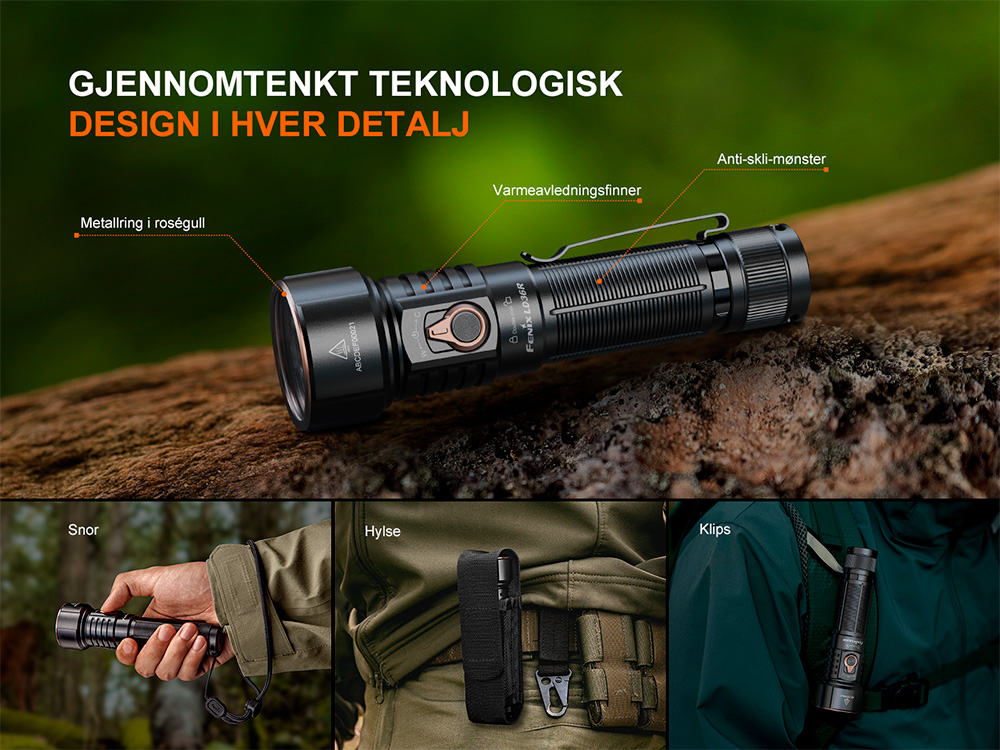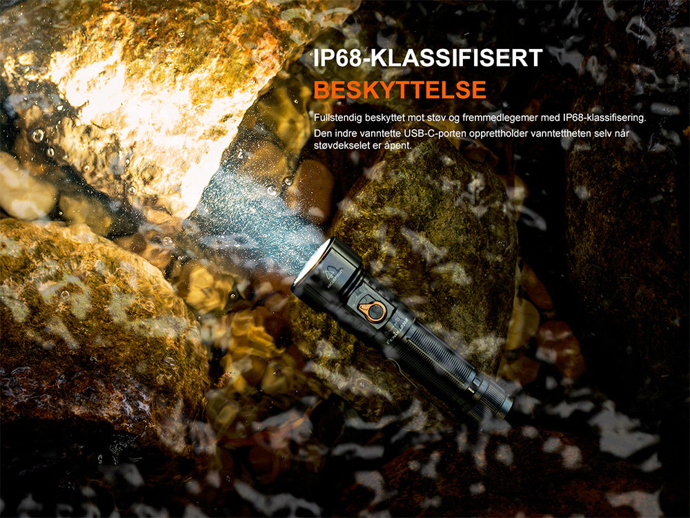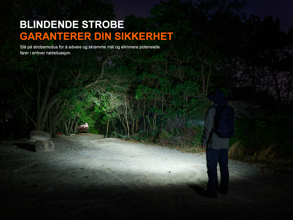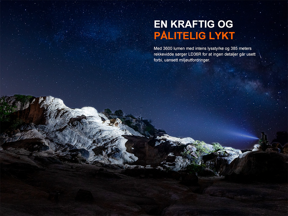 • Maksimal lysstyrke på 3600 lumen og maksimal rekkevidde på 385 meter.